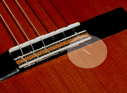 There are a few advantages – they look neater, the basses are very simple to tie, and they give a more consistent and slightly larger break angle for the strings over the saddle. However, although the basses are very simple to tie, the trebles need a bit more care, and it’s very important to make sure the strings are tied correctly. Poorly tied strings (with either 6-hole or 12-hole tie-blocks) can lead to the end of the string slipping out of the tie-block, whipping round, and hitting the soundboard with some force, causing damage of this type: